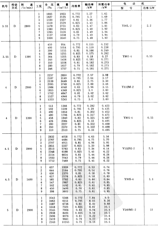 1)本風(fēng)機為單吸入風(fēng)機,機號有No.3.15、3.55、4、4.5、5、5.6、6.3、7.1、8、9、10、11.2、12.5、14等共14個機號組成。